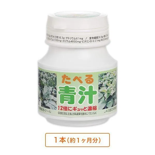 平成18年度さつまいも食品コンクール奨励賞受賞! 素材にこだわり無添加。 大自然の栄養素が12倍に濃縮。 野菜不足かな?と感じている方へ 体にいいと分かっていても、毎日摂れない”新鮮野菜”。 たべる青汁は・・ ビタミンA総カロテンは、キャベツの約132倍! ビタミンKは、キャベツの約44倍! カルシウムは、キャベツの約40倍! 鉄は、ほうれん草の約9倍! 食物繊維は、ほうれん草の約10倍! 亜鉛は、牛乳の約6倍! 真空冷凍乾燥法で栄養を守る! 1日4粒~8粒で野菜不足を解消しませんか? 原料は農薬不使用。JAS認定有機栽培のケール・すいおうです。