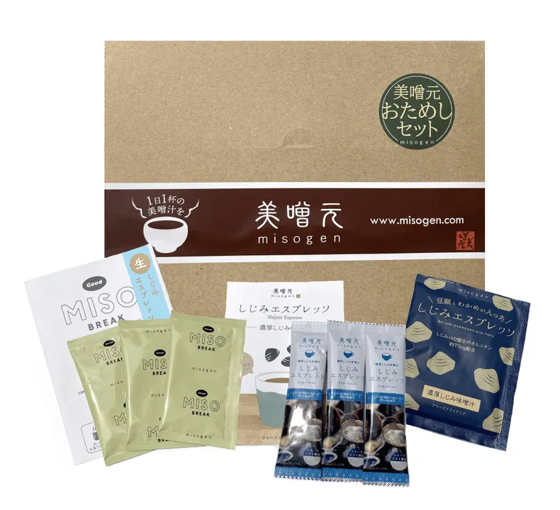 美噌元の人気商品「しじみエスプレッソ」を、3種飲み比べできるおためしセット。 濃厚しじみ汁をどこでも気軽にキュッと飲める「しじみエスプレッソ」×3本、食事と一緒に楽しめる「\具が入った/しじみエスプレッソ」×1袋、新商品・風味豊かな生タイプの「Good MISO BREAK」×3袋の詰め合せ。 木樽寝かせの八丁味噌をベースに信州赤白合わせ味噌とブレンドした濃厚しじみ味噌汁「しじみエスプレッソ」。お好みの「しじみエスプレッソ」を見つけて、コーヒー代わりに気軽に一杯! 「しじみエスプレッソ」… 元祖しじみエスプレッソ。フリーズドライの粉末タイプ。しじみ100個分のオルニチン約51mg配合。90ccのお湯で溶かしてキュッとどうぞ。スッキリと飲んでいただくため、具材は入っていません。 「\具が入った/しじみエスプレッソ」… しじみエスプレッソにしじみ・わかめ・豆腐を入れました。しじみ140個分のオルニチン約77mg配合。120ccのお湯で溶かしてお食事と一緒に。 「Good MISO BREAK」… 風味豊かな生タイプのしじみエスプレッソ。150ccのお湯で溶かして、生タイプならではの本格的な風味をお楽しみ下さい。