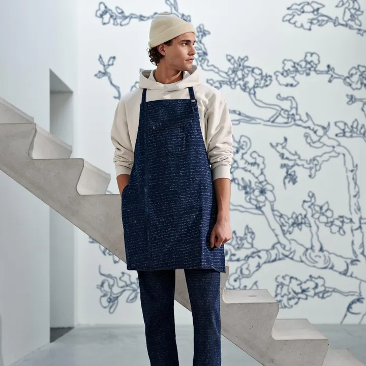 スターリーブルーカラーのヴァンエプロン。 ゴッホの直筆と文字がレーザープリントされています。 胸元にはジーンズポケットがあり、首とウエストのボタンストラップは調節可能です. 《最小発注数について》 在庫あり商品の場合は1本~可。海外発注の場合は同ブランド商品10本~可。 こちらの商品は一部要海外発注となります。