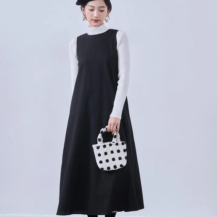 こちらのジャンパーワンピースは夏バージョンの物より首回りやアームホールを大きく設定して作ってありますので、INに薄手のニットやシャツをレイヤードできるようにゆとりを作りました。またインサイドの仕様にも新たな工夫改善を施しより綺麗な仕上がりとなりました。 程よい厚さのリネンコットンミックスの生地で、体のラインを拾いにくく安心してパッと被れるAラインワンピース。前身ごろはシンプルミニマルな印象で、ポイントは後ろにある大きなタックと背中見せのデザイン。シンプルの中にアクセントを加え、バックシルエットが可愛い抜け感のあるデザインにしました。 程よいフレアー感と背中の開きがコーディネート次第で大人っぽい印象にもなります。◎ポケットあり。 #AW#ワンピース#ジャンパースカート#リネン混#シンプル#定番#人気#Aライン#ミニマル#ナチュラル#ノースリーブ#タック#再入荷#秋#冬#レイヤード