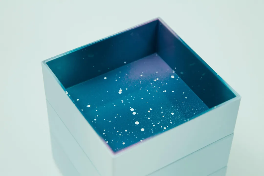 お菓子だけではなく、アクセサリーやファッション小物を収納できる三段重です。 山中温泉の白と川のコントラストが成す雪景色を具現化したデザイン。 外側は白と青のグラデーション、内側は川に光が差し込み雪が舞っているような変わり塗です。