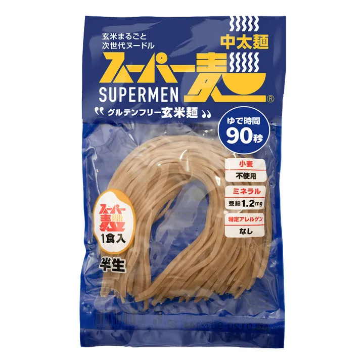 ◆細麺・平打麺・中太麺のアソート100食セット◆ <スーパー麺の特長> ● 原材料は玄米と馬鈴薯でんぷんのみ! ・国産:玄米 ・北海道産:馬鈴薯でんぷん ※生産工場でも小麦は一切不使用(コンタミの心配がありません) ● 独自製法の生麺食感! ・米粉麺と侮るなかれ!驚きの「コシ」「モチモチ」感 ・今までになかった生麺パスタのような食感を実現 ● 時短!ゆで時間は細麺でたったの60秒!/平打麺・中太麺は90秒! ・すぐに食べられるから、キャンプなどでも大好評 ・電子レンジでも調理OK ● 化学調味料など不使用! ・化学調味料、保存料、着色料など一切不使用 ・お塩も不使用 ● 保存食にも! ・賞味期限は製造から1年 ・常温保存OK(夏場は冷蔵庫保存がおすすめ) ・災害時の非常食としてもおすすめ <息子のために開発> 「スーパー麺」は、小麦を食べられなくなった息子のために、その父親が全国を駆けまわり、試行錯誤の末に完成したグルテンフリーヌードルです。 <栄養成分表示> 1食100gあたり エネルギー 243kcal/たんぱく質 3.3g/脂質 0.2g/炭水化物 57.0g -糖質 55.2g -食物繊維 1.8g/食塩相当量 0g/亜鉛 1.2mg/カリウム 190.0mg/鉄 1.3mg/マグネシウム 23.0mg