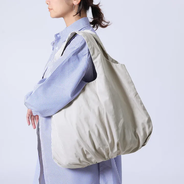 荷物を入れると底部のタックとギャザーがふっくらと膨らんで可愛らしいシルエットのトートバッグです。開口部は荷物の出し入れがしやすいサイズに、ハンドルは肩の負担になりにくい幅広寸法に仕上げました。大きめの内ポケットは取り出しやすい深さにしております。厚手で丈夫なナイロン素材なので、デイリーに小旅行にオススメのアイテムです。