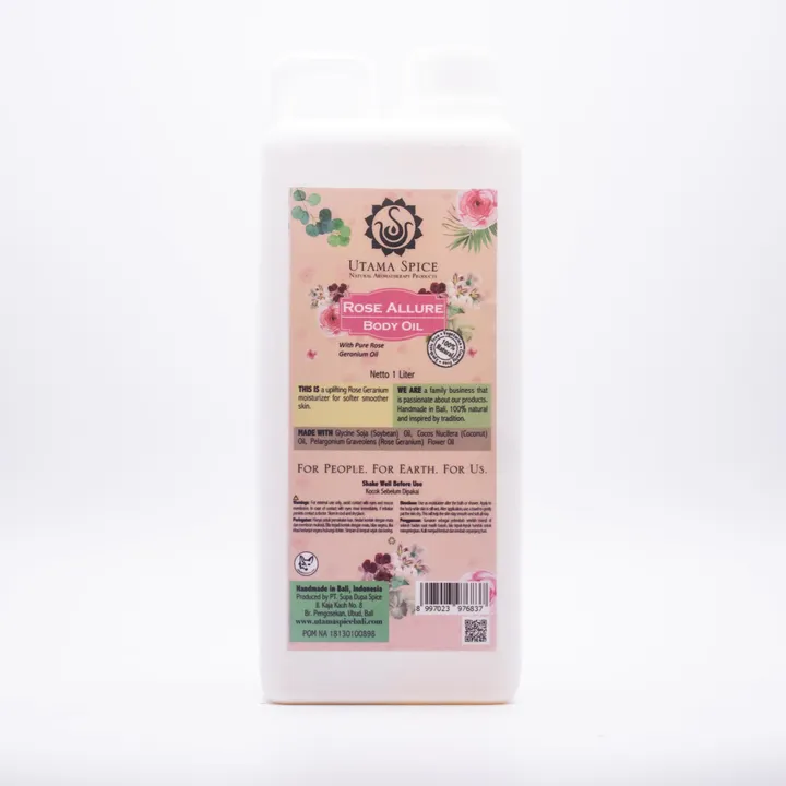 ローズアリュール ボディオイル 1Lまるでローズガーデンにいるかのように、優雅で華やかな香りに包まれるボディオイルです。 肌にすっとなじみ、豊かなうるおいを与えるヤシ油(ココナッツオイル)をベースに、ローズゼラニウムの精油をブレンド。 女性らしい幸福感に満ちた香りが、毎日のお手入れを特別なセルフケアの時間へと昇華させます。 ── 製品特長 ──豊かなうるおいで、輝くツヤ肌へ: 保湿力に優れたヤシ油(ココナッツオイル)とダイズ油が、乾燥した肌の角質層のすみずみまで浸透。 うるおいに満ちた、輝くようなツヤのある肌へと導きます。 年齢に応じたお手入れに: 肌にハリと弾力を与え、乾燥による小じわを目立たなくします(※効能評価試験済みではありません)。 キメの整った、若々しい印象の肌を目指す方に。 肌を穏やかに整える: デリケートに傾きがちな肌の、肌荒れを防ぎ、穏やかに整えます。 乾燥による肌トラブルが気になる方にもおすすめです。 心をほぐす、優雅なローズの香り: ローズゼラニウムの甘く、ロマンティックな香りが心と身体の緊張をほぐし、リラックスした気分へと誘います。 ── ご使用方法 ──保湿オイルとして: シャワーや入浴後の、水分が少し残った肌に適量をなじませると、うるおいを効果的に閉じ込めることができます。 マッサージオイルとして: 手のひらでオイルを温め、デコルテや腕、脚などをやさしくマッサージします。 優雅な香りが広がり、リラックス効果が高まります。 フレグランスオイルとして: 手首や耳の後ろなどに少量なじませれば、香水代わりにもお使いいただけます。 ── こんな方におすすめ ──優雅で女性らしいローズ系の香りが好きな方乾燥による小じわや、肌のハリ不足が気になる方リラックスしながら、贅沢なボディケアを楽しみたい方しっとりするのにべたつかないオイルを探している方原材料一覧 ダイズ油、ヤシ油、ニオイテンジクアオイ油その他必要な情報 パラベン、サルフェート、合成香料は使用していません。 優雅な香りをその肌に。 自分をもっと愛おしむ、ラグジュアリーなひとときを。