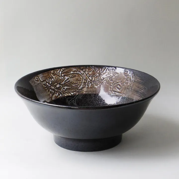 坦々麺や豚骨ラーメンを引き立たせる黒釉のラーメン丼。勢いのある雲龍がスタイリッシュで家にいながら本格的なラーメンを堪能出来ること間違いなしです。 ■カネ定製陶/土岐市 明治2年、岐阜県土岐市に創業。駄知の自然溢れる山の上に窯を構え、四季を感じながら陶磁器製造をされている駄知をリードする量産メーカー。「量産の中にも愛情を!」をモットーに職人による筆巻きや施釉を行い、手仕事を一手間加え他社との差別化を図っています。創業より「どんぶり」に特化し時代とニーズに応え続けています。