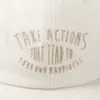 大きめの細文字刺繍の入ったショートつばのボールキャップ。ウォッシュド加工風な生地を使用しました。使い始めから馴染みのある程よいユーズド感。アウトドア、タウンユースにも合わせやすいゆるいタッチのデザインです。