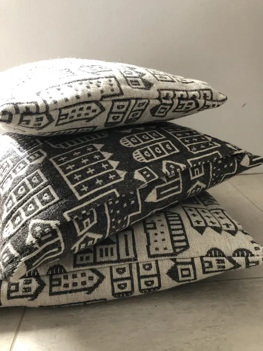 手織りジャガード織り クッションカバー  無染色ウール 原産国ネパール 45cm角(パンヤはついていません) ジャガード織の布を使って作ったウールのクッションカバーです。 アンダイドプラスのオリジナルで楽しい街の雰囲気をデザインし、ネパールで手織りのジャガード織で制作しました。 手織りのジャガードは力のかけ具合で柄が伸びたり縮んだりと難しく熟練の技術がいります。手仕事で出来上がった布は人の手で織った温かみとやさしい味わいが感じられます。 無染色のの羊毛を使っているので、微妙な濃淡がやさしく飽きさせません。 白地に茶色、茶色地に白で柄の2種類。ジャガードは両面織りなので、反転し白地に模様のものと色地に白の模様の2パターンが出来上がります。チャックでパンヤを出し入れする使用です。35×35cmの小さいサイズもあります。 undyed+(アンダイドプラス)は無染色の良さに魅せられ生まれたブランド。自然によって育まれた柔らかな色味は、人工的には出すことのできない美しさと、どこか心を落ち着かせてくれる魅力があります。その微妙な色のやさしさも感じていただけると思います。使うほどに、その上質な素材と人の手によるあたたかさを感じていただけます。 *手作りの為、多少サイズ、色目、デザインに誤差があることご了承ください。