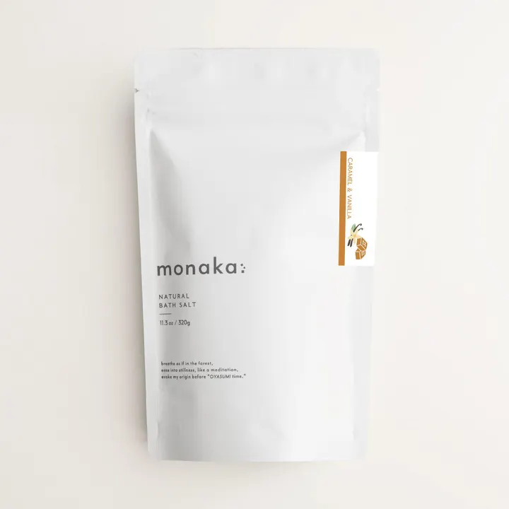 monaka ナチュラルバスソルト キャラメルバニラ 40g(1回分) / 320g(8回分) 【森の中を歩くような心地よい入浴を】 目指したのは「極上のバスソルト」 花や果実、草木など、自然そのままの香りや色合いを大切に仕上げました。 まるで素材を味わうかのように浸る、優しい入浴時間。 【キャラメルバニラ】 キャラメル × バニラエクストラクト -香ばしいキャラメルとバニラの甘さが、湯船に溶ける穏やかな香り- 頑張った一日の終わりに。 濃厚なミルクと、リッチなバニラの深い甘さを感じる至福のひととき。 【LINE UP】 〇プレミアムヒノキ 〇プレミアムはちみつレモン 〇はちみつジンジャー 〇ゆずシトラス 〇プレミアムみかん 〇プレミアムラベンダー 〇プレミアムローズ 〇クレイ月桃 〇キャラメルシナモン 〇キャラメルバニラ 【ミネラル豊富で環境にも優しい天然塩】 西オーストラリアの塩田で製造される「シャークベイソルト」を使用。 太陽と風の力で2~3年かけて結晶化させる「天日塩製法」で作られた塩は、環境にも優しいだけでなく、 カルシウム・マグネシウムなどのミネラル成分が豊富に含まれる。 【ヒアルロン酸Na配合】 1gで約6Lもの保水力を誇る、保湿美容成分を配合。 【使用法】 140~160Lのお湯に対して40g程度を目安に入浴前に入れてご使用ください。 【お知らせ】 ●追い焚きしないでください。 ●色や香りが残らないよう、入浴後はすぐに洗い流してください。 ●商品の特性上、LOTや時間で色や香りが変わることがあります。 ●本品は雑貨です。 【販促物】 ◇ブランドカード(A5サイズ) ◇各種香り説明カード(名刺サイズ/縦) ◇共通プライスカード(名刺サイズ/横) ご入用の方は、備考欄にてお申し付けください。 関連ブランド・・・ ◇tamamono organic = 植物の力で心と体を整える / オーガニックコスメ、アロマ ◇WAKAPLUS = 和の香りを日常にプラスする / バスソルト ◇manaplus PRO = 美容サロンなどで使用するプロユースコスメ / キャリアオイル、アロマ ◇KOTOLABO = 京都発のフレグランスブランド / 練り香水、お清めミスト ◇monaka = 素材を味わう10種のバスソルト / ヒノキ、はちみつレモン、ラベンダー など