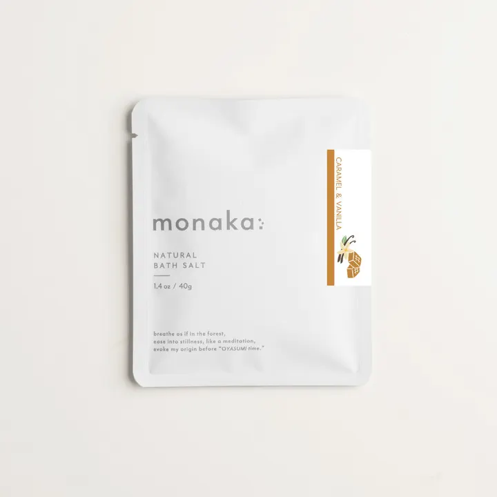 monaka ナチュラルバスソルト キャラメルバニラ 40g(1回分) / 320g(8回分) 【森の中を歩くような心地よい入浴を】 目指したのは「極上のバスソルト」 花や果実、草木など、自然そのままの香りや色合いを大切に仕上げました。 まるで素材を味わうかのように浸る、優しい入浴時間。 【キャラメルバニラ】 キャラメル × バニラエクストラクト -香ばしいキャラメルとバニラの甘さが、湯船に溶ける穏やかな香り- 頑張った一日の終わりに。 濃厚なミルクと、リッチなバニラの深い甘さを感じる至福のひととき。 【LINE UP】 〇プレミアムヒノキ 〇プレミアムはちみつレモン 〇はちみつジンジャー 〇ゆずシトラス 〇プレミアムみかん 〇プレミアムラベンダー 〇プレミアムローズ 〇クレイ月桃 〇キャラメルシナモン 〇キャラメルバニラ 【ミネラル豊富で環境にも優しい天然塩】 西オーストラリアの塩田で製造される「シャークベイソルト」を使用。 太陽と風の力で2~3年かけて結晶化させる「天日塩製法」で作られた塩は、環境にも優しいだけでなく、 カルシウム・マグネシウムなどのミネラル成分が豊富に含まれる。 【ヒアルロン酸Na配合】 1gで約6Lもの保水力を誇る、保湿美容成分を配合。 【使用法】 140~160Lのお湯に対して40g程度を目安に入浴前に入れてご使用ください。 【お知らせ】 ●追い焚きしないでください。 ●色や香りが残らないよう、入浴後はすぐに洗い流してください。 ●商品の特性上、LOTや時間で色や香りが変わることがあります。 ●本品は雑貨です。 【販促物】 ◇ブランドカード(A5サイズ) ◇各種香り説明カード(名刺サイズ/縦) ◇共通プライスカード(名刺サイズ/横) ご入用の方は、備考欄にてお申し付けください。 関連ブランド・・・ ◇tamamono organic = 植物の力で心と体を整える / オーガニックコスメ、アロマ ◇WAKAPLUS = 和の香りを日常にプラスする / バスソルト ◇manaplus PRO = 美容サロンなどで使用するプロユースコスメ / キャリアオイル、アロマ ◇KOTOLABO = 京都発のフレグランスブランド / 練り香水、お清めミスト ◇monaka = 素材を味わう10種のバスソルト / ヒノキ、はちみつレモン、ラベンダー など