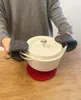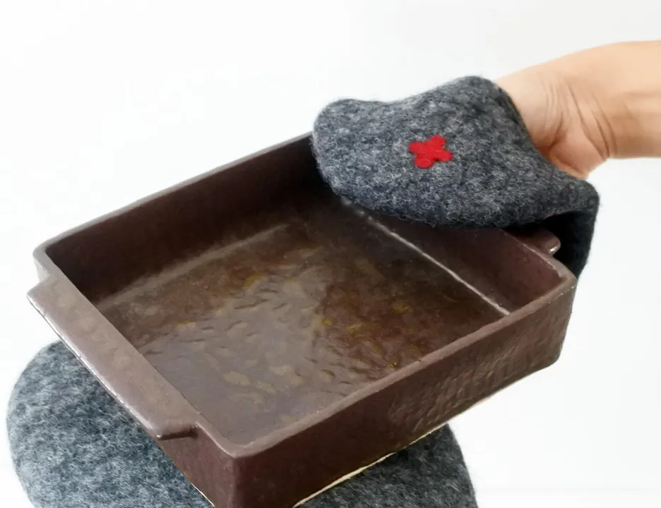 フェルト鍋つかみ 楕円型 グレーに赤いプラス