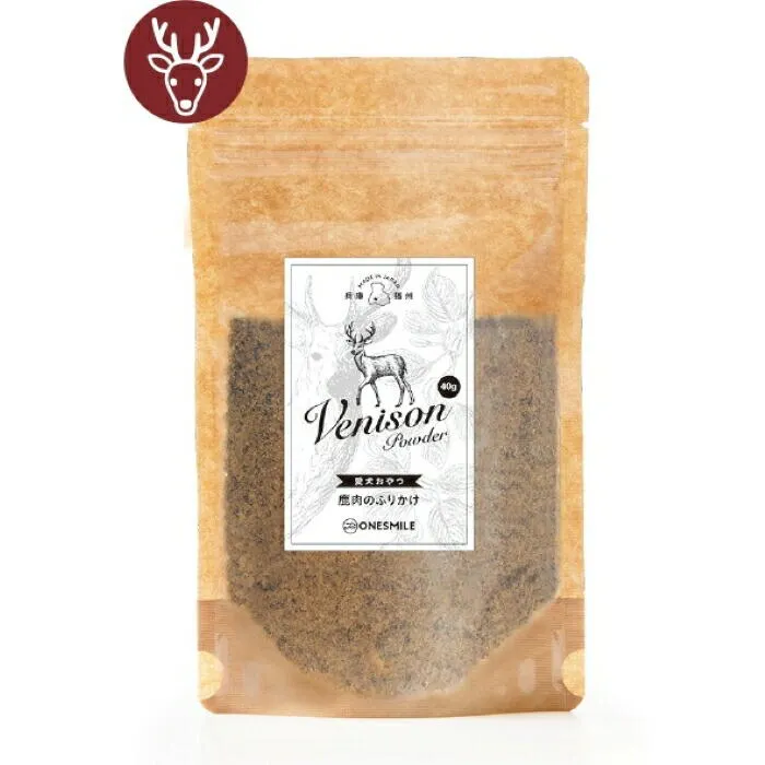 新鮮で美味しい鹿肉を風味豊かなふりかけにしました。いつものごはんのふりかけにおすすめです。 成分表(100g当たり): エネルギー 300kcal 粗タンパク質 75%以上 粗脂肪 3.0%以上 粗繊維 0.1%以下 粗灰分 5.0%以下 水分  13.0%以下 1日当たりの給与量: 超小型犬(5kg以下) 5~10g 小型犬(5~10kg) 15~20g 中型犬(10~25kg) 25~50g 大型犬(25~40kg) 50~70g
