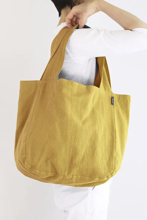 オリジナル生地「ウォッシュドコットン」で作ったバッグ。 丸みを帯びたシルエットと幅広の持ち手が特徴的です。 比較的たっぷりとした容量で、ちょっとしたお出かけにも重宝します。 エコバッグとしても使えます。