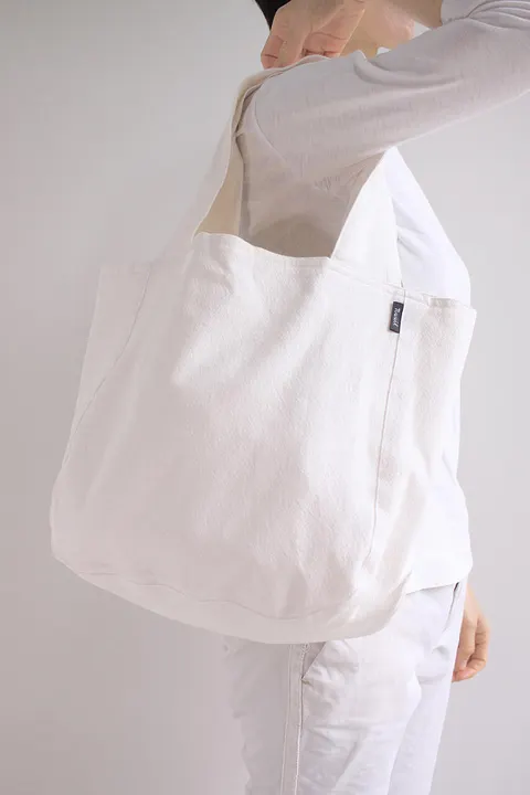オリジナル生地「ウォッシュドコットン」で作ったバッグ。 丸みを帯びたシルエットと幅広の持ち手が特徴的です。 比較的たっぷりとした容量で、ちょっとしたお出かけにも重宝します。 エコバッグとしても使えます。