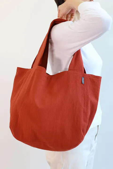 オリジナル生地「ウォッシュドコットン」で作ったバッグ。 丸みを帯びたシルエットと幅広の持ち手が特徴的です。 比較的たっぷりとした容量で、ちょっとしたお出かけにも重宝します。 エコバッグとしても使えます。