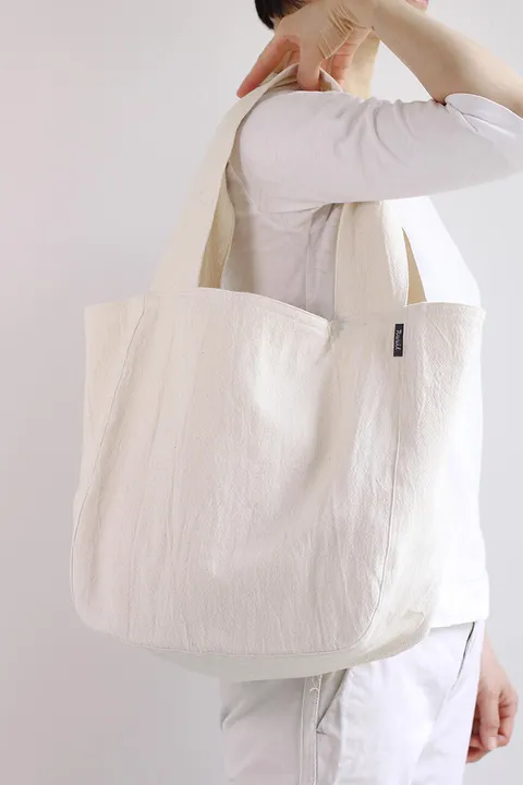 オリジナル生地「ウォッシュドコットン」で作ったバッグ。 丸みを帯びたシルエットと幅広の持ち手が特徴的です。 比較的たっぷりとした容量で、ちょっとしたお出かけにも重宝します。 エコバッグとしても使えます。