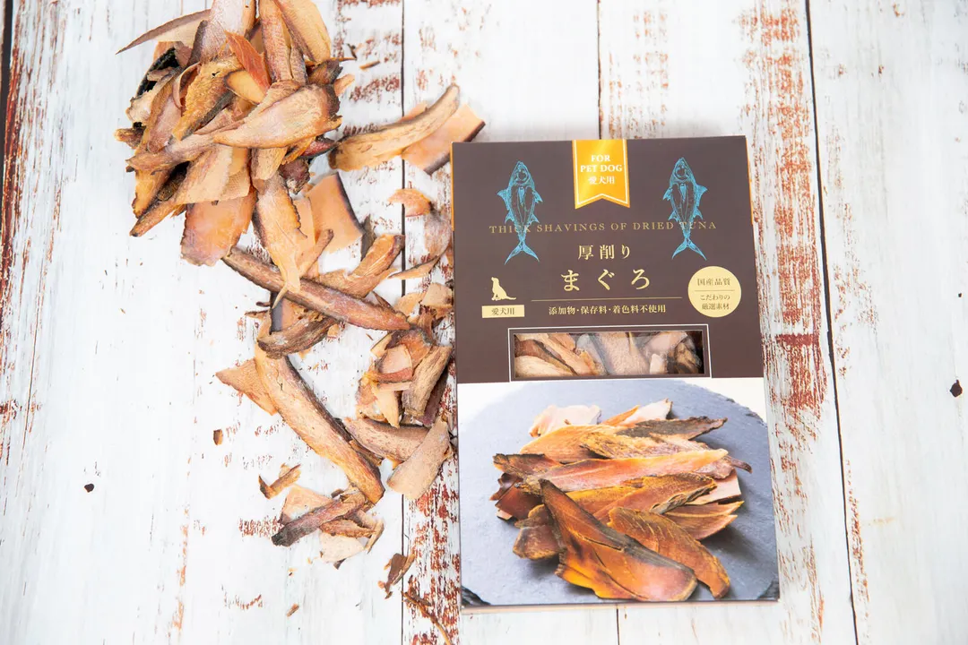 国産まぐろにこだわり、一枚一枚厚削りした 添加物・保存料・着色料不使用の厚削りまぐろを 是非ご堪能下さい。 食感を残す為にあえて厚めに削り、コク、旨味、 風味豊かな味わいをお楽しみ頂けます。 お湯で出汁をとってフードと一緒に お召し上がり頂くこともできます。