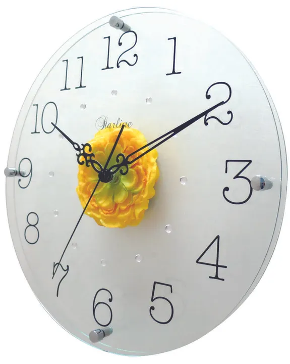 2枚のクリアなガラスに黄色のラナンキュラスの造花を挟んだ、かわいくておしゃれな壁掛け時計です。 美しく鮮やかなラナンキュラスの造花は、爽やかさと同時に豪華な空間を演出します。 どんなインテリアにも調和し、日常を彩るアートピース。時間の経過を優雅に告げるこの時計は、目にするたびに笑顔を運びます。 リビング、寝室などはもちろん子供部屋でも可愛い! またラナンキュラスには「晴れやかな魅力」「光輝」「合格」という花言葉があります。 黄色のラナンキュラスの花言葉は「優しい心遣い」という意味があります。 母の日、誕生日、開店祝い、記念日など様々なシーンのプレゼントにも最適です。 ぜひこの機会にご利用くださいませ。