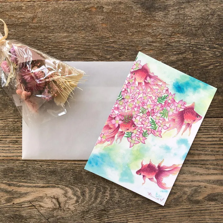 飯塚 月の”花と金魚”シリーズのポストカードセット 5枚入り 飯塚 月 2014年から蜂をテーマにした作品を描き始める。 2017年ころより様々なテーマに取り組み、アトリエで蜂や出目金、ベタを飼いはじめ、 最近は極細ボールペンや色鉛筆を使い金魚を描いている。 『物心つくころにはもう絵を描くのが好きだった。 絵は心の隙間を埋める、私の唯一の表現方法だった。 蜂の巣のように隙間だらけだった心は、もうすっかり埋まったように思う。 私の描く絵が、誰かの心の隙間を少しでも埋められたら、と思う。』 ● サイズ:100mm×148mm  お使いのデバイスにより商品写真のお色が実際と異なることがあります。ご了承ください。