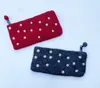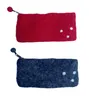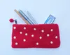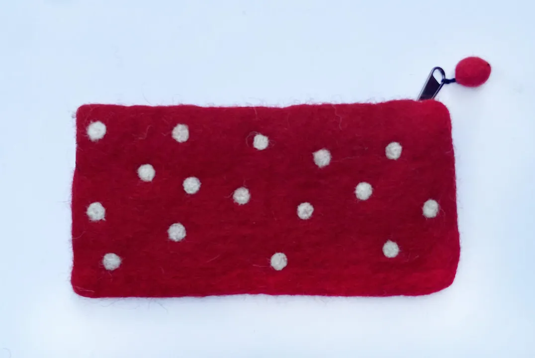 すべて手作業で作られた、小さめのかわいいポーチです。 ドット模様がフェルトの柔らかい感じを引き立てています。 フェルトのポーチはクッション性があるので、眼鏡ケースやペンケースにピッタリです。 ドット模様は針で何度もさして、フェルト地にからませていくニードルポイントで施します。 裏面にもドットが3つ入っています。 フェルトは縫い目がないのが特徴で,羊毛に石鹸水のようなアルカリ性の水溶液を含ませて圧力をかけ、もんだり巻いて転がしたりして縮絨(しゅくじゅう)させ成形します。縮絨にはたいへんな手間隙がかかります。中面にはコットンの裏地が付いています。手作りのほっこりしたあたたかさを感じてください♪