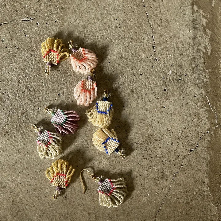 《受注生産アソート》 小ぶりなフリンジピアス 太陽を浴びると透けるようなビーズとマットなビーズのミックス アクセントカラーと色々な形のビーズに真鍮が 存在感を出します。 繊細なビーズを使用しているのでお取り扱いはご注意ください。 発送についてーーーーーーー 一つ一つ手作業の為ご注文数と時期により完成のお時間に違いがあります。お急ぎの場合は事前にご相談ください。