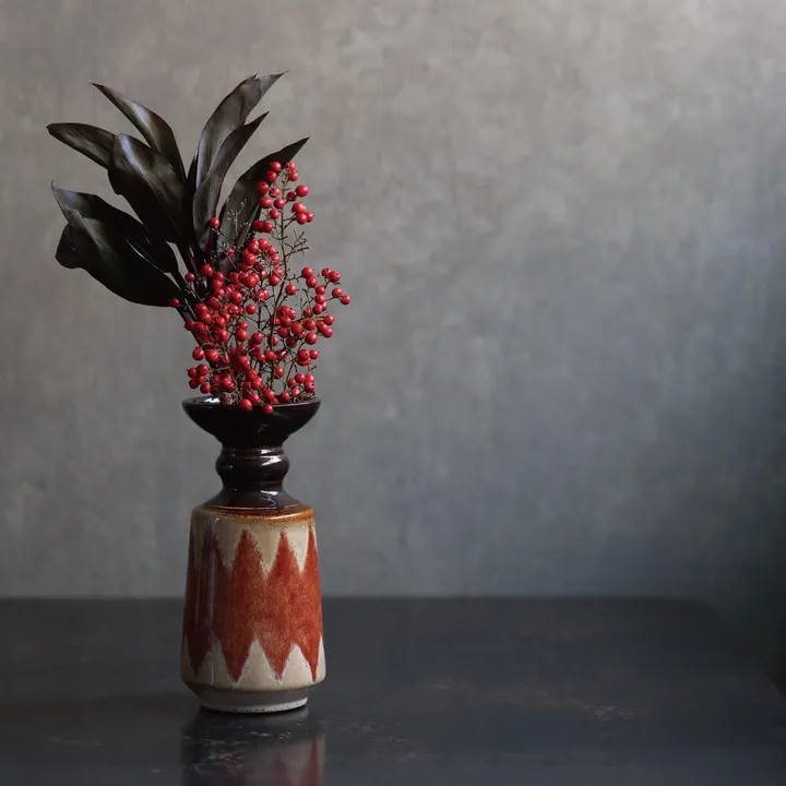 異国の息吹を感じるエキゾチックな美【MILADA】 違和感を感じるも見事に調和のとれたカラーバランス 遠い異国に想いを馳せる美しさと奥深い色合いと幻想的な色使いのベース 特徴のあるデザインだが、大きさ、口のサイズも実用的 生産地 CHINA サイズ Φ100 x H210 mm / 550g 素材 セラミック