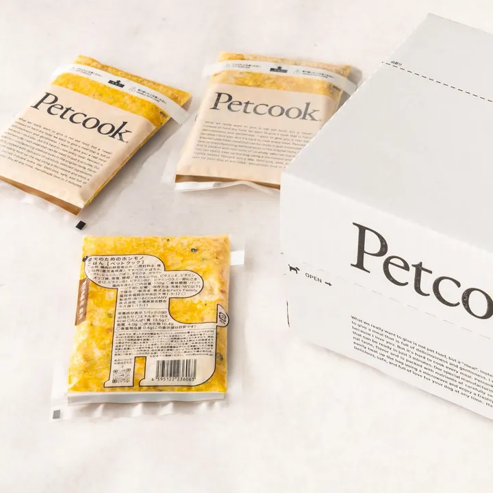 毎日に寄り添うやさしいごはん。 - CHICKEN RECIPE - Petcookのチキンレシピは、鹿児島県産の「さつま純然どり」を100%使用しています。 さつま純然どりは、自然豊かな環境で平飼いで健康に育った純国産若鶏。 鶏の腸内環境まで考えられた栄養バランスの良い飼料を食べ、のびのびと育ったさつま純然鶏は、ジューシーで旨味たっぷりの鶏肉です。その柔らかい肉質は小さな愛犬にとって低脂質のままおいしさが詰まった良質なたんぱく質になります。 さらに健やかな体の土台となる睡眠の質や心の安定をサポートするトリプトファンが、愛犬のからだと心の健康を優しく支えます。 また、ビタミンやミネラルが豊富な野菜もすべて国産の新鮮素材を使用し、スチーム調理と特許技術を採用した冷凍方法で、食材本来のおいしさと栄養を守っています。 保存料や防腐剤などの添加物は一切使用せず、「食品」としての安全性とおいしさをとことん追求した、Petcookの理念が詰まったごはんです。 【特徴】 ・鹿児島県産「さつま純然どり」100%使用 ・消化にやさしいスチーム調理 ・特許技術を採用した冷凍製法 ・保存料一切不使用 【特にこんな方にぜひ】 ・食が細く、胃が敏感な子に ・涙やけ・皮膚の健康を気にしている子に ・ストレスや緊張しやすい性格の子に 【内容量】 1袋当たり150g×6袋 【保存温度帯】 冷凍(-18℃以下) 【賞味期限】 冷凍状態で約8ヶ月 ※冷蔵保存の場合は未開封で5日、開封後は2日以内にお召し上がりください。 【原材料】 鶏むね肉(鹿児島県産さつま純然どり)、キャベツ、かぼちゃ、トマト、にんじん、ごぼう、すりごま、ガラクトオリゴ糖、酵母/貝カルシウム、ビタミンE、ビタミンB12、ビタミンB1、ビタミンB2、ビタミンD3(一部にごま・鶏肉を含む) 【お召し上がり方】 冷凍庫から出して、パックごと電子レンジで解凍(湯煎や冷蔵庫での解凍も可能)。 食器に必要な量を移して完成です。(人肌程度の温度が適温です)。 【 1日あたりの目安量】 ※あくまで目安としてご案内しておりますため、愛犬さまの体調や生活スタイルに応じて適宜ご調整くださいませ。 Petcookフルサポートプラン (主食としてPetcookが100%量の場合) ・体重1kg:67g ・体重2kg:114g ・体重3kg:154g ・体重4kg:192g ・体重5kg:227g ・体重6kg:261g ・体重7kg:294g ・体重8kg:326g ・体重9kg:357g ・体重10kg:387g Petcook ハーフ&ハーフプラン (ドライ50%+Petcook50%の場合) ・体重1kg:34g ・体重2kg:57g ・体重3kg:77g ・体重4kg:96g ・体重5kg:113g ・体重6kg:131g ・体重7kg:147g ・体重8kg:163g ・体重9kg:179g ・体重10kg:194g 保存方法 到着後は冷凍庫(-18℃以下)で保管し、加熱・開封後は2日にご消費ください 冷凍状態での賞味期限は約8ヶ月です(パッケージに記載) トッピングとしてのご利用も可能ですが、健康サポートという面では毎日のごはんの50%以上をPetcookに置き換えていただいた際に、より嬉しいご実感の声を多くいただきます。まずはトッピングから始めて少しずつ割合を増やし、愛犬さまの健康を支える主食としてのご活用を推奨しています。 ※食品衛生法に則っているため、税率は8%で設定しています