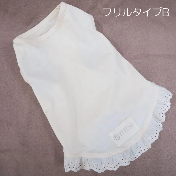 ■なぜペットなのに肌着? ⼼から安⼼して暮らせる100%オーガニックコットンを使⽤した⾐類で体質改善のお⼿伝いをしたい、そんな想いから『AVVERA』(アジェラ)は誕生しました。 希少なオーガニックコットンを贅沢に使用している理由は、実は人よりも犬や猫の方が肌トラブルが多いから。 肌疾患の割合は人が成人で100万人とされている一方で、犬はなんと25%、猫は15%とされています。 痒みやあかみ、むれなど、日本の変わりゆく気候の中では良い状態を保つのも容易ではありません。 人だけでなく、ペットも快適に過ごしてほしい。 肌ストレスを徹底的に軽減するため弊社が厳選したオーガニックコットン原綿から独自に生地を開発しました。 使用しているスムース生地は非常になめらかで、シルクの様な風合いをもちながらしっとりとした感触の触っていたくなるような生地です。 ■なぜ肌に優しいのか? オーガニックコットンの独自素材は吸湿性、通気性が高く、更に伸縮性もあり活発に動き回るペットも快適に過ごせます。 片方の脇の切替を無くし、裏側の縫い目を最低限に抑え、すべての縫い代をフラットに仕上げました。 着ることで日差しや寒暖差、虫など外部の刺激からも守ることができます。 密着する肌に限りなくストレスフリーに、ファクトリーブランドだからこそできるこだわり「低刺激」仕様です。 何もつかないシンプルな「肌着」だからこそ、この上からお洋服を着せてケアしながらおしゃれをすることもできます。 フリルの種類は Aタイプ チェックとドット Bタイプ シンプルなドット Cタイプ アンティークレース   の3種を各サイズからお選びいただけます。 Sサイズ 前着丈 17.5㎝ 後着丈 20.5㎝ 首回り 24㎝ 胴囲  34㎝ Mサイズ 前着丈 18.5㎝ 後着丈 21.5㎝ 首回り 26㎝ 胴囲  44㎝ Lサイズ 前着丈 21.5㎝ 後着丈 24.5㎝ 首回り 31㎝ 胴囲  50㎝