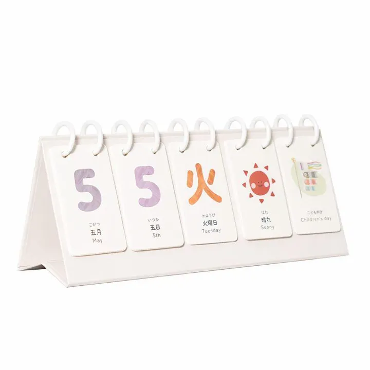 毎日めくるのがワクワクする! 知育めくりカレンダー 「今日は何月何日?」 「外のお天気はどうかな?」 そんな毎日の何気ない会話が お子様にとっての楽しい学びに変わります。 3歳前後の「心身の土台」が作られる 大切な時期に、言葉やイメージで日々を捉える習慣を。 お子様の感性を育む 優しいウッドデザインの万年カレンダーです。 【商品の魅力ポイント】 五感で楽しむウッドデザイン 温かみのある木目調のデザインで お部屋のインテリアにも馴染みます。 色鮮やかなイラストは お子様の視覚を刺激し「自分でめくりたい!」 という好奇心を形にします。 充実の5列配置で「予定」まで把握 月・日・曜日に加え 「天気」や「行事(イベント)」まで並べられる5列仕様。 今日がどんな一日になるのか、ひと目で確認できるから 見通しを持って過ごす力が身につきます。 裏面は英語学習に!2WAYで長く使える カードの裏面には、仕事・家族・動物・乗り物などの 英語表記付きイラストを収録。 カレンダーとしてだけでなく 英単語の知育カードとしても活躍します。