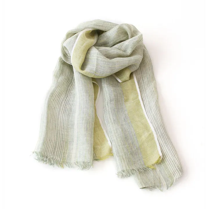 【ボリュームを少し抑えたスカーフタイプ】 デリケートな首元にもチクチクすることがない上質リネンを使ったオリジナルのリネンススカーフです。上質で軽やかなリネンは、使い込むほどに柔らかく肌に馴染んでいきます。 ☑ コンセプト 「健康」「環境」「造り」をコンセプトにしたインテリアショップ自社開発のリネン製品 ☑ 天然素材100% 天然素材100%の高品質なアイテムを使いやすい価格で「リネン製品をもっと気軽に」 ☑ 低ホルムアルデヒド 定期的に国内でホルムアルデヒド検査を実施、お子さまからお年寄りまでからだにも環境にも安心 【オールシーズン使える上質リネン】 リネンって夏だけ?と思っている方はサラッとした肌触りながら、やさしい暖かさに驚かれると思います。 あたたかい素材のストールは気分じゃない・・・ 映画館や観劇で肌寒くなってしまう・・・ そんなときも、リネンストールなら重くなりすぎず、季節の変わり目にも重宝します。 もちろん、夏の室内での冷房対策や首元の日焼け防止にも。持ち歩くときは、バッグに結んでしまってもアクセントに。無造作にバッグにつっこんでもなぜかサマになります。 【デザイン】 森の木々、咲きほこる花、川や海の水に光が差し込んで揺らいで見えるあの色の感じを表現したデザイン。同系色の糸に濃淡をつけ何色も織り重ねてグラデーションにすることで、ほっと癒されるような1枚になりました。 ■オレンジ オレンジ、ライトオレンジ、オレンジイエロー、ライトイエロー、カーキ、ベージュを縦糸に組み合わせ、横糸にライトベージュを差し込み、より揺らいだ雰囲気のデザインに。 ■パープル パープル、ライトパープル、ラベンダーパープル、ベージュ、クリームを縦糸に組み合わせ、横糸にライトベージュを差し込み、淡いラベンダーのような雰囲気のデザインに。 ■ブルー ミドルブルー、ネイビー、ライトブルー、2種類のホワイトを縦糸に組み合わせ、横糸にホワイトを差し込み、霞のある地平線のような雰囲気のデザインに ■グリーン 黄緑、若草、モスグリーン、ベージュ、クリームを縦糸に組み合わせ、横糸にオフホワイトを差し込み、芽吹いた新緑のような爽やかな雰囲気のデザインに。