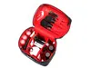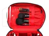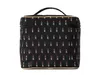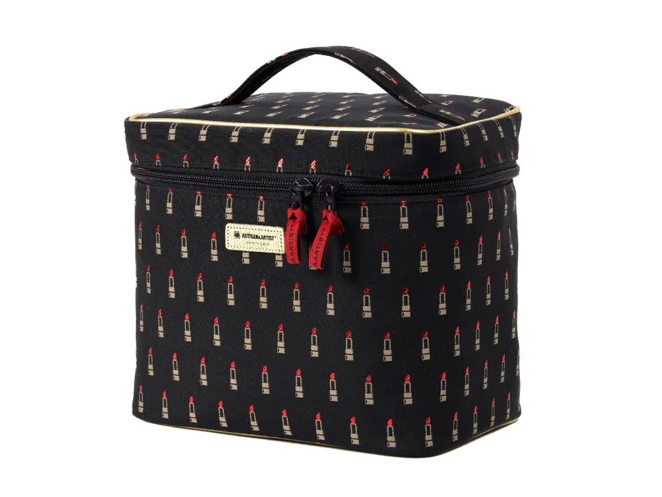 ブラックカラーの上に輝く、メタリックなラメ糸で織られた真紅のリップスティックとパイピングのゴールドカラーのアクセントが、何とも言えない大人可愛いデザインです。 背が高く、ボトルやスティックタイプのコスメアイテムの収納に優れたバニティ。 蓋の裏側には5つのブラシホルダーとブラシカバーが付いており、ブラシの毛先をしっかり保護し、粉飛びの心配もありません。 充実した収納力が魅力の本体には、両サイドに4つのペンホルダーと5つのボトルホルダーを配置。取り外しが可能な2枚の仕切りには、ボトルホルダー/ゴムバンド、リップホルダー/透明ポケットの異なるタイプの収納スペースが付いています。