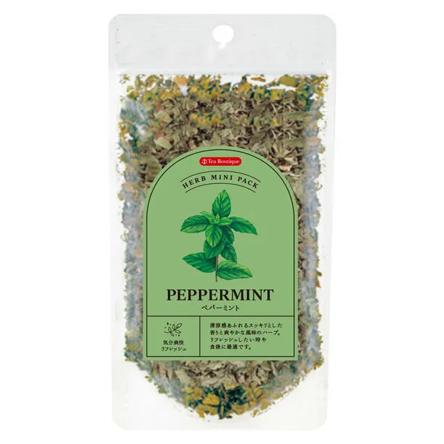 ハーブミニパックシリーズは、さまざまな種類のハーブを手軽にお楽しみいただけるラインナップ。袋にはつり下げ可能なフック穴が付いています。 ペパーミントは、清涼感あふれるスッキリとした香りと爽やかな風味のハーブ。リフレッシュしたい時や食後に最適です。 ハーブティーの他、お風呂、石鹸、ポプリ、枕の下、ハーブ染め、ハーブピロー等に幅広くご利用いただけます。 ▼美味しい淹れ方 温めたティーポットに、ティースプーン1杯(約1.5g)のハーブを入れ、沸騰したてのお湯(1人分150ml)を注ぎます。 3分蒸らして温めたカップに茶漉しで漉しながら注ぎます。 *浸出時間はお好みで調整してください。 *アイスティーの場合は半分のお湯の量で浸出し、氷のたっぷり入ったグラスに一気に注ぎ入れてください。 おすすめブレンド ■スッキリしたい時に ペパーミント ①:レモンバーム ①