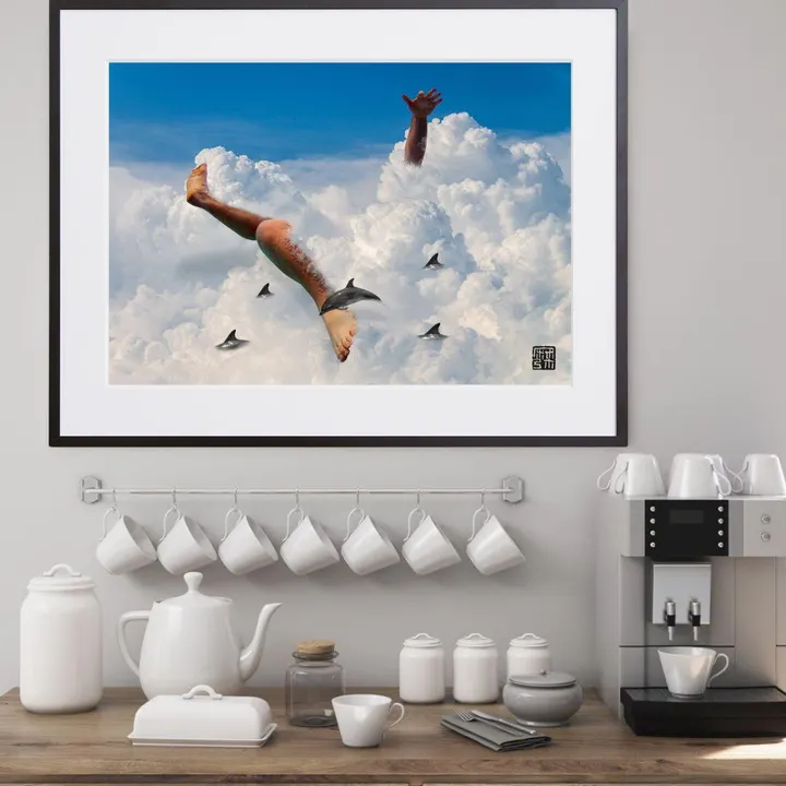 アーティスト -PROFILE- 藤本 麻弥 / Maya Fujimoto(マヤ フジモト) 2000年よりスペインの国境付近のフランス在住 リゾート地の観光局で広告デザイン全般を担当 人の価値観を変える事、さまざまな色や形で溢れ出る感情や世の中の傷、 生きる歓喜と哀しみのようなメッセージを表現したいと思っている。 主に雑誌の切り抜きや折り紙を使ったアナログコラージュ、 フォトショップを使ったデジタルコラージュを世界に発信する。 【作品について】 幻想的な雲の合間に、現実では有り得ない物が。 イルカや子供の手足が突き出しています。 シュールながら一度目にしたら忘れられない強烈な印象を残します。 作品名:私は自分の直感を信じる方だ 手法:写真、デジタルコラージュ ペーパー:高品質半光沢紙 マットカラー:白 マット*:DXホワイト芯 100%バージンパルプ/PH7・中性紙(2mm厚) ※全てのアートにマットがつきます フレームカラー:黒、白、無垢(3種類から選択) ※マット付のため通常とはフレームサイズが異なる規格となります。 【マット*とは?】 アートポスターの周りに挟んだ厚紙の事。 マットを使わない時に比べ余白により広がりが生まれ、作品の新たな一面を引き出せ作品の見栄えがグッと良くなります。また、額縁のガラス面と作品が直接触れたままにしておくと、くっついて作品を傷つけることがあります。マットを使用することでガラスと作品の間に空間ができ、作品を保護することができます。ブランドコンセプトにより全てのアートにマットがつきます。 ー ファッションのようにアートを ー 私達が掲げるコンセプトです! 毎日着替えるファッションの様に、アートも気軽に飾り変えて欲しい... 一旦飾り終えたアートにも光を当ててほしい... ポスター単体、またはリピートで中身だけのポスターを購入された方に"専用のハンガー"をセットでお届け。 「今までに無い!新しいアートの飾り方を提案」 飾る事がなくなった前のアートをハンガーにかけて洋服と一緒にかけてもらう。 その日の気分や、モチベーションですぐに取り換えられる様に。 もちろん、魅せる収納としても今までにないおすすめの飾り方です。