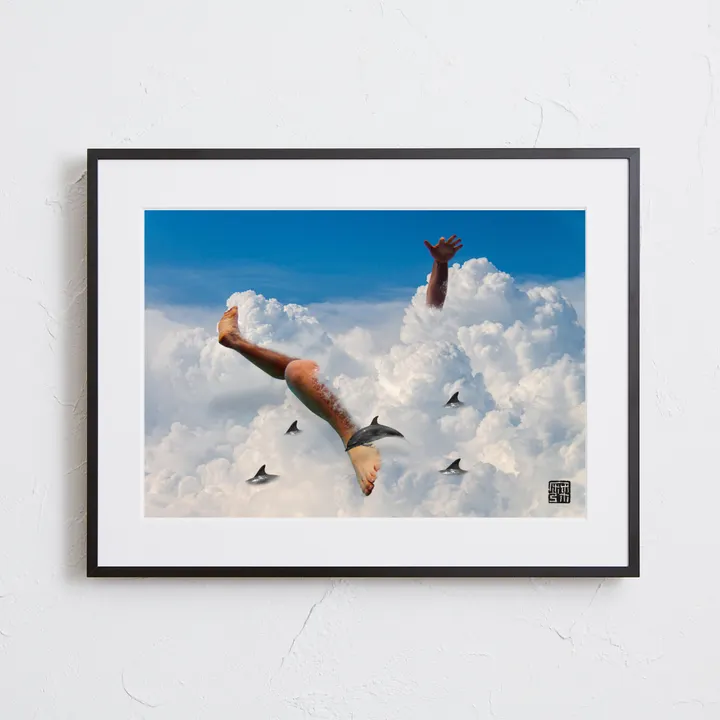 【現代アートポスター】 風景景色 空 雲 イルカ 人物 写真コラージュ A4(S) フレームセット:黒 29.4×38.4cm