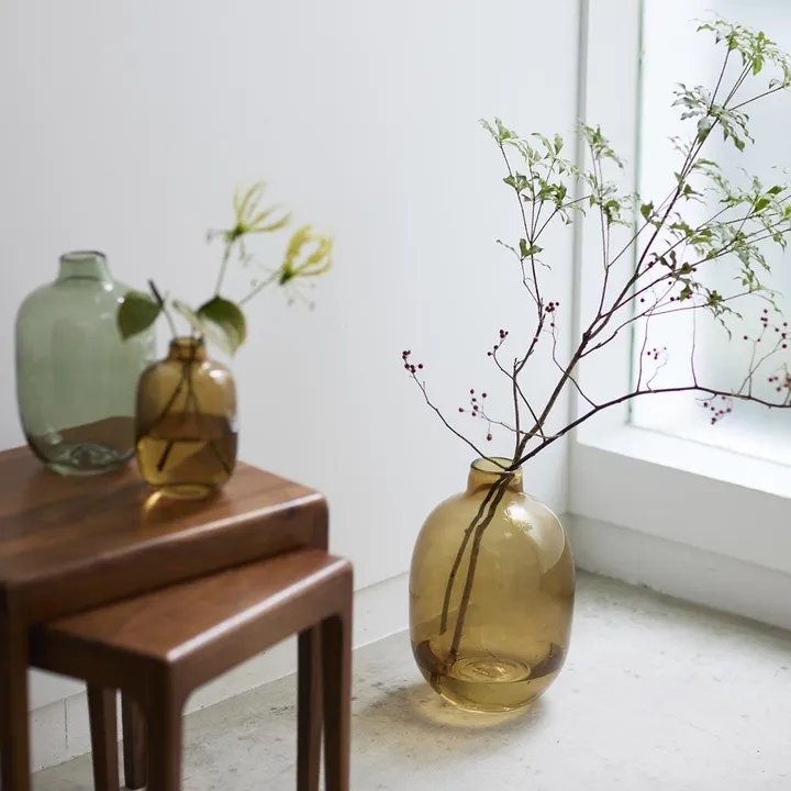 落ち着いたアンバーとグリーンの色合いが魅力のフラワーベースのシリーズ。 植物の美しさを引き立て、ナチュラルで落ち着いた雰囲気を演出します。 シンプルでタイムレスなデザインは、どんなインテリアにもマッチしやすく、単体でも美しいインテリアとして楽しめます。 豊富なサイズと形状のバリエーションで、一輪の花から大ぶりな枝物まで、さまざまなディスプレイに対応。 植物や空間に合わせて最適なフラワーベースをお選びいただけます。 組み合わせて使用することで空間にリズムが生まれ、より洗練された印象を演出。 季節やイベントに応じたアレンジで、インテリアのアクセントとして幅広く活躍します。