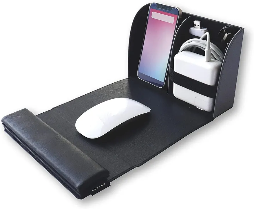 【マウスパッドと一体型でフタを開けてすぐできるワークスペース】 マウスやコードなどを収納することができるポーチです。 ポーチのフタ裏はマウスパッドとなっているので場所を選ばず作業ができ、リストレスト一体型なので快適に作業が行えます。 “リストレスト一体型のマウスパッド” ・2種類の高さが選べるリストレスト。 ・折り返せばスポンジ入り。 ・手首が疲れにくく長時間の作業も快適です。 “スマートフォンスタンド機能付き” ・収納部分がスマートフォンスタンドとして使えます。 ・PC作業中も通知や着信を見逃すことはありません。 “オーガナイザーとしても使える自立式ポーチ” ・PCツールの整理はフポーチの中に収納ができるので、デスク周りはスッキリです。