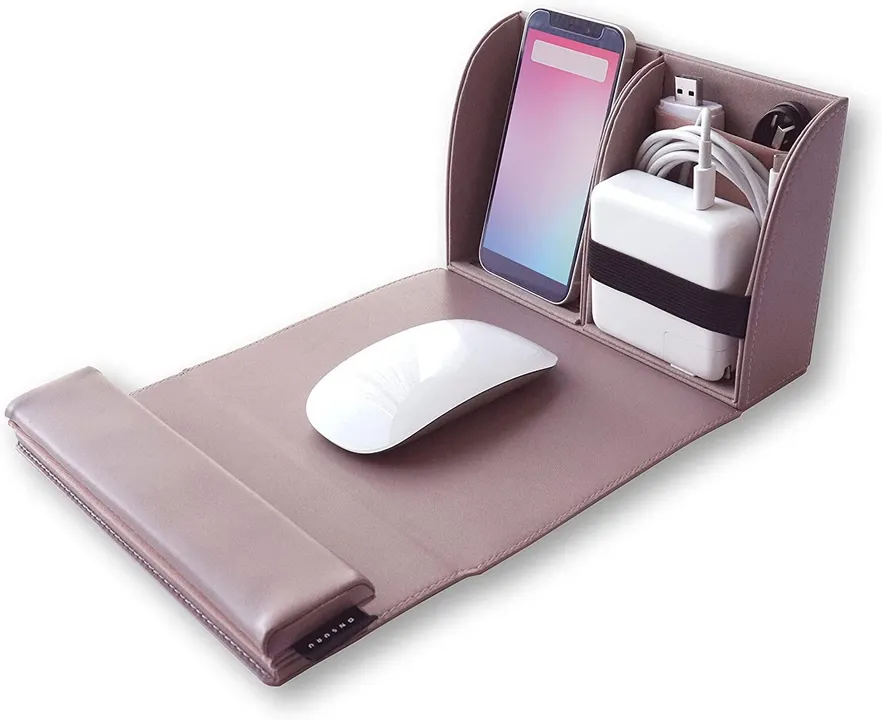 【マウスパッドと一体型でフタを開けてすぐできるワークスペース】 マウスやコードなどを収納することができるポーチです。 ポーチのフタ裏はマウスパッドとなっているので場所を選ばず作業ができ、リストレスト一体型なので快適に作業が行えます。 “リストレスト一体型のマウスパッド” ・2種類の高さが選べるリストレスト。 ・折り返せばスポンジ入り。 ・手首が疲れにくく長時間の作業も快適です。 “スマートフォンスタンド機能付き” ・収納部分がスマートフォンスタンドとして使えます。 ・PC作業中も通知や着信を見逃すことはありません。 “オーガナイザーとしても使える自立式ポーチ” ・PCツールの整理はフポーチの中に収納ができるので、デスク周りはスッキリです。