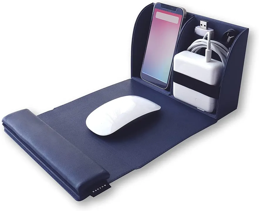 【マウスパッドと一体型でフタを開けてすぐできるワークスペース】 マウスやコードなどを収納することができるポーチです。 ポーチのフタ裏はマウスパッドとなっているので場所を選ばず作業ができ、リストレスト一体型なので快適に作業が行えます。 “リストレスト一体型のマウスパッド” ・2種類の高さが選べるリストレスト。 ・折り返せばスポンジ入り。 ・手首が疲れにくく長時間の作業も快適です。 “スマートフォンスタンド機能付き” ・収納部分がスマートフォンスタンドとして使えます。 ・PC作業中も通知や着信を見逃すことはありません。 “オーガナイザーとしても使える自立式ポーチ” ・PCツールの整理はフポーチの中に収納ができるので、デスク周りはスッキリです。