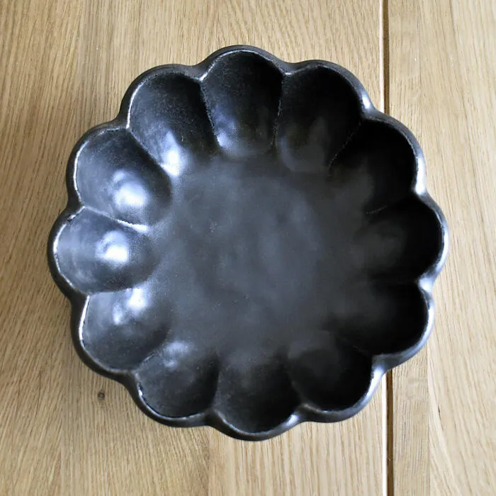 上から見ると花が咲いたようでとても華やかな器。それでいて暖かみあるやさしい色合いで、和洋問わずお使いいただけます。表面は少し起伏を持たせたでこぼこした作りで、手にしっくりと馴染みます。土物の器に見えますが、実は磁器製でとても丈夫です。普段使いからおもてなしまで幅広く活躍しそうです。シリーズでお使いいただいても単品使いでも、食卓に華を添えてくれそうです。