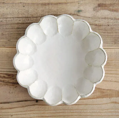 上から見ると花が咲いたようでとても華やかな器。それでいて暖かみあるやさしい色合いで、和洋問わずお使いいただけます。表面は少し起伏を持たせたでこぼこした作りで、手にしっくりと馴染みます。土物の器に見えますが、実は磁器製でとても丈夫です。普段使いからおもてなしまで幅広く活躍しそうです。シリーズでお使いいただいても単品使いでも、食卓に華を添えてくれそうです。