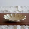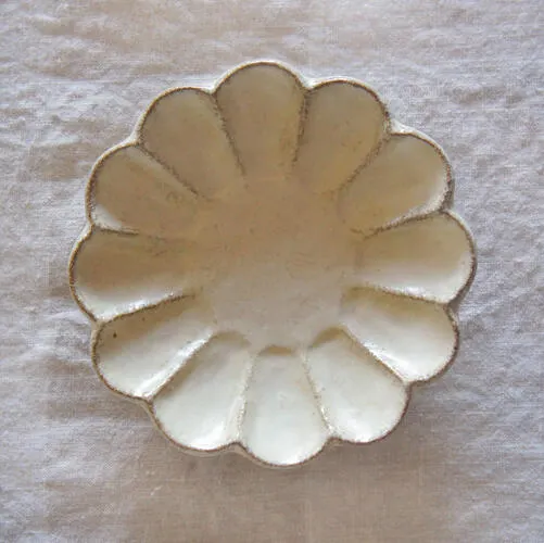 上から見ると花が咲いたようでとても華やかな器。それでいて暖かみあるやさしい色合いで、和洋問わずお使いいただけます。表面は少し起伏を持たせたでこぼこした作りで、手にしっくりと馴染みます。土物の器に見えますが、実は磁器製でとても丈夫です。普段使いからおもてなしまで幅広く活躍しそうです。シリーズでお使いいただいても単品使いでも、食卓に華を添えてくれそうです。