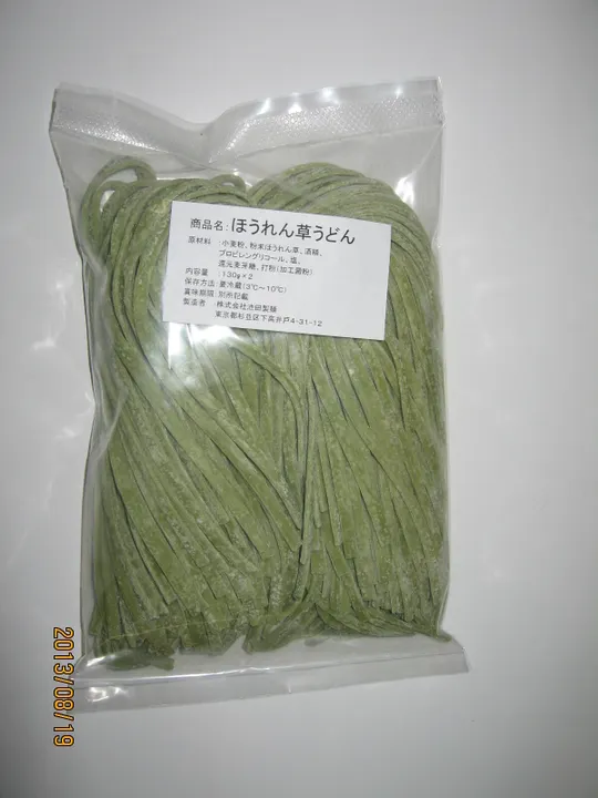 麺生地にほうれん草粉末をねり捏ねました。 ほうれん草の色合いをおたのしみください。 通常のうどんと同じくめんつゆで召し上がっていただく他に、クリームソースやミートソースかけてパスタのようにご利用いただいております。