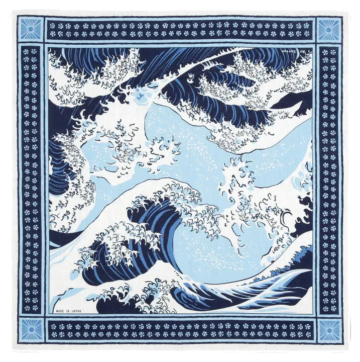 日本 BANDANA バンダナ 日本文化をテーマにしたバンダナチーフ。 漫画、アニメ、ファッション、伝統、歴史、文様など、日本カルチャーを描きました。 日本の風景を描く上で欠かせないものが「波」。様々に描かれてきたGreatWaveの魅力は、日本文化の一つとされています。形のさだまらない「水」を日本人独特の感性で様々な形で描き、無数の水に関わる文様を生み出します。