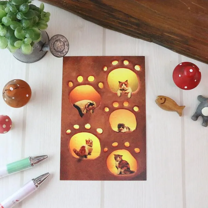 にくきゅうの形をしたニッチでくつろぐネコたちがかわいいポストカード。