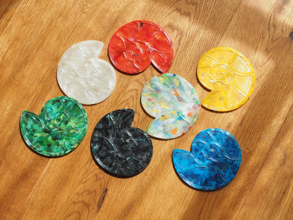 【海洋プラスチックごみ、ほぼ100%で作られたプロダクト】 独自の成形方法により、ゴミが持っていた色をそのままに一つずつ異なる色・模様を持っています。
