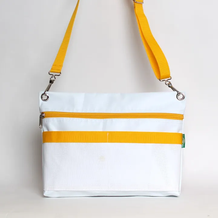 ~ RUSTICターポリンシリーズ~ 横断幕用のターポリンの端材・残材で作ったバッグコレクション。堅牢なターポリンは耐久性・耐水性・防汚性に優れ、普段使いからヘビーデューティーまで広くシーンをカバーします。数百種ある生地の中からバッグに最適な、軽くて腰のある素材を選びました。自立する、ほど良い張りが使い勝手を高めます。横断幕の裏面を表に使用しているので、表面は白、裏面には印刷が入っている場合がありRUSCTICの人気のヒミツです。 ■お財布、スマホ、鍵束、ちょっとした書類や化粧品など、どしどし入れてタスキ掛けするサコッシュです ■サイズ調整ができるストラップは取り外し可能。お手持ちのストラップに交換できます ■外メッシュポケット1 内ポケット1 ■H23cm W33cm D3cm ストラップ140cm ■日本製
