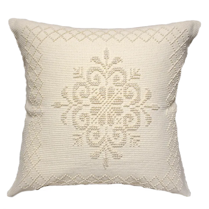 【コットン100% ピビオーネ織クッションカバー45×45cm】 イタリア、サルデーニャ島の代表的な織物技法“ピビオーネ織り”を使用し製作されたコットン素材100%の上品さとぬくもりを兼ね備えたクッションカバー。生地表面に飛び出す糸の輪っかでデザインが施され絵柄が立体的に浮き出ているのが特徴です。ピビオーネ織りの部分は熟練の職人が手作業で制作しています。デザインは古くから受け継がれてきた伝統的なモチーフ、『Pistoccu ピストック』にフレームの装飾が施された上品なデザイン。コットン素材のため特別なお手入れは不要です。洗濯機又は手洗い ノスタルジックな雰囲気に都会的な洗練されたデザインの要素を感じるモチーフ、日常のシーンに馴染みながらも目に映るたびに心地よい印象を与えてくれます。特別な空間を演出するために欠かせないアイテムです。カラーによって印象ガラッと変わります。空間に合わせてお好みのカラーをチョイスしていただくのがおすすめです。