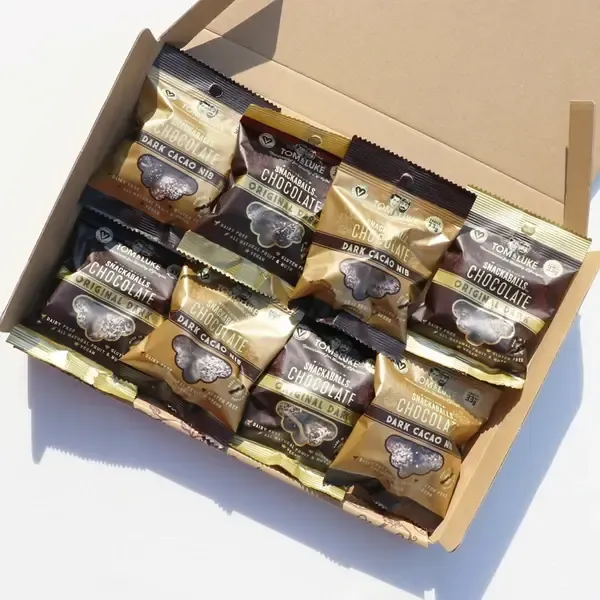 【溶けない!常温流通可能】 トム&ルークの人気フレーバー<オリジナルダーク33g×4個、カカオニブ33g×4個>が入ったアソートボックスセット! プレゼントや3種類入っているのでお試しとしても最適! 🔳<ヴィーガン対応>罪悪感にサヨウナラ!新感覚のギルトフリーチョコレート。 🔳デーツとナッツから作られたチョコレートボール。 🔳グルテンフリー、精製砂糖不使用、乳製品不使用、卵不使用、ヴィーガンでヘルシーなおやつとしてお召し上がりいただけます。 🔳精製砂糖不使用でドライフルーツのデーツ本来の甘さをいかし、食べ応え抜群です。 【トム&ルークとは?】 ニュージーランドで大人気のパーソナルトレーナー「トム」と、客足の絶えないレストランのシェフ「ルーク」が健康と美味しさを形に変えた実力派スイーツです。 【健康と美味しさをカタチに】 甘いものは食べたいけど、砂糖はできれば摂りたくない!そんな願いをドライデーツの甘さを最大限に生かして実現しました。 【まるで本物のチョコレート?!】 カカオも使用しているためチョコレートのような感覚で召し上がれます。 【健康に欠かせないアーモンド】 ビタミンE、食物繊維、ミネラルが豊富に含まれるアーモンドを、ドライデーツと一緒に混ぜて食べやすくしました。 (対象商品:オリジナルダーク33g、ダークストロベリー33gに使用) 【こんな時にオススメ】 🔳ダイエット中で、砂糖を使ったスイーツを控えている時 🔳トレーニングの栄養補給 🔳小腹が空いた時 🔳朝ごはんに十分な時間が取れない時 🔳コーヒータイムに 🔳ワインのお供に 🔳ハイキングなどお出かけ時に 🔳忙しい時 🔳食べているときに音が気にならないので、オフィスで仕事中にもサクッと食べられる