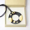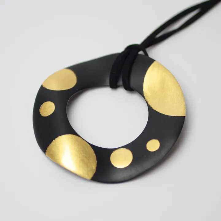 素材:アフリカンブラックウッド(グラナディラ)、純金箔、革紐エコレザー、真鍮 サイズ:7.5cm×7.5cm ○MPINGO〈ムピンゴ〉 木管楽器などに使われる「アフリカン・ブラックウッド」は、準絶滅危惧種に指定されている希少銘木材です。楽器製作時に生じる規格外部品を再活用して、彫刻家の繊細な技巧により、高級感のある商品へとアップサイクルしました。音楽の持つ素晴らしさと世界を平和にする力、そして地球上の環境問題やそれを支える方々の取り組みを、ジュエリーという形でお届けしていきます。