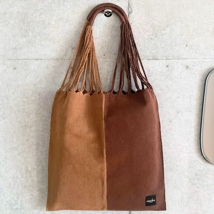 【BI brown/バイ ブラウン】 ブラウンとキャメルのバイカラーのハンモックバッグ。 シンプルな色合いであるが故に、ツイストストラップの美しいフォルムが引き立ちます。 どんな装いにも合わせやすいバッグで実はベストセラー。 お洒落な方に選ばれています。 メキシコの山岳民族が伝統的な織物技法を使って織るオールハンドメイドのハンモックバッグ。 ハンモックを織る技法を使っているので、ハンモックバッグと呼ばれています。 ポイントとなる美しいツイストストラップは、他ではなかなか見かけないフォルム。テキスタイルは日本でデザインされています。 現地織り手民族の経済的支援も備えた、サスティナブルでヴィーガンなバッグです。 メキシコの太陽の下、庭先でおもいおもいに機織りをする女性たち。 丹念に手織りされた布は両端を縫い合わせられ、バッグのかたちになります。 そしてそのバッグは メキシコから約 10,000km 以上離れた日本まで旅をします。 遥か遠い国の太陽の下で織られたこのバッグが、 あなたの毎日に ささやかな彩りを添えることを願っています。 ・この製品はハンドメイドのため、若干のサイズの個体差などが見られる場合があります。製品上の特性としてご理解いただけましたら幸いです。 ・ご自宅の洗濯機で洗濯する際は、単独でネットを使用されることをお勧めいたします。