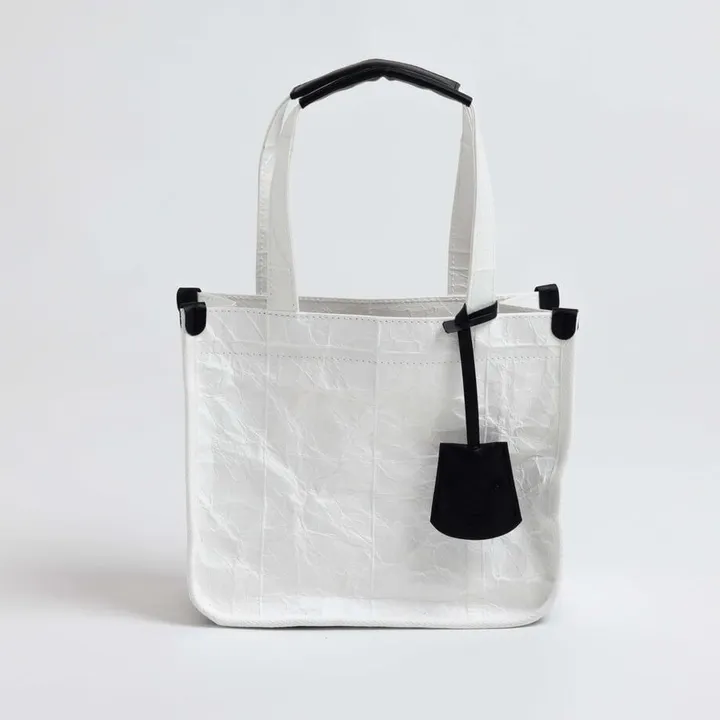 このトートバッグは8枚の牛乳パックを使用しています。 革を鞣したような風合いのデザインに仕上げています。 全てのパーツに紙パックを使っており、本来の防水機能そのまま。 持ち手・底・口箇所には革を使って補強することで見た目はリサイクルと感じさせない高級感があります。 耐荷重についても4Kgの重さまでOK。 革は鞄職人が鞄を作る際に残る革を再利用しているので、大量生産はできず、そして紙パックの各銘柄もそのまま生かすことで、世界でたった一つのデザインバッグとなっています。 mowmm10の刻印がついたチャーム付きです。 【マテリアルインフォメーション】 サイズ: 巾22.5㎝×高19.5㎝×奥行9.5㎝ 持ち手: 立ち上がり 15㎝ 重さ : 181~189g 革  : ブラック 内装の紙パックの銘柄はイメージ写真となりますので、ご注文いただいた時の在庫状況によってお手もとに届く紙パック柄は異なることがございます。 ※使用する紙パックにつきましては再利用での活用である為、組み合わせのご希望にはお応え出来かねませんので大変申し訳ございませんがご了承くださいますようお願い申し上げます。 【色について】 商品写真はできる限り実物の色に近づけるようにしておりますが、お使いのモニター設定、お部屋の照明等により実物の商品と色味が異なる場合がございます。 【お取り扱いのご注意】 〇汚れた時は、食器洗い洗剤などを生地に浸みこませて拭き取り、その後水拭きをしてください。 〇先端のとがった物や、カッター等の刃は商品を傷つけ、破損の原因となります。 〇火気のそばには置かないようにご注意ください。